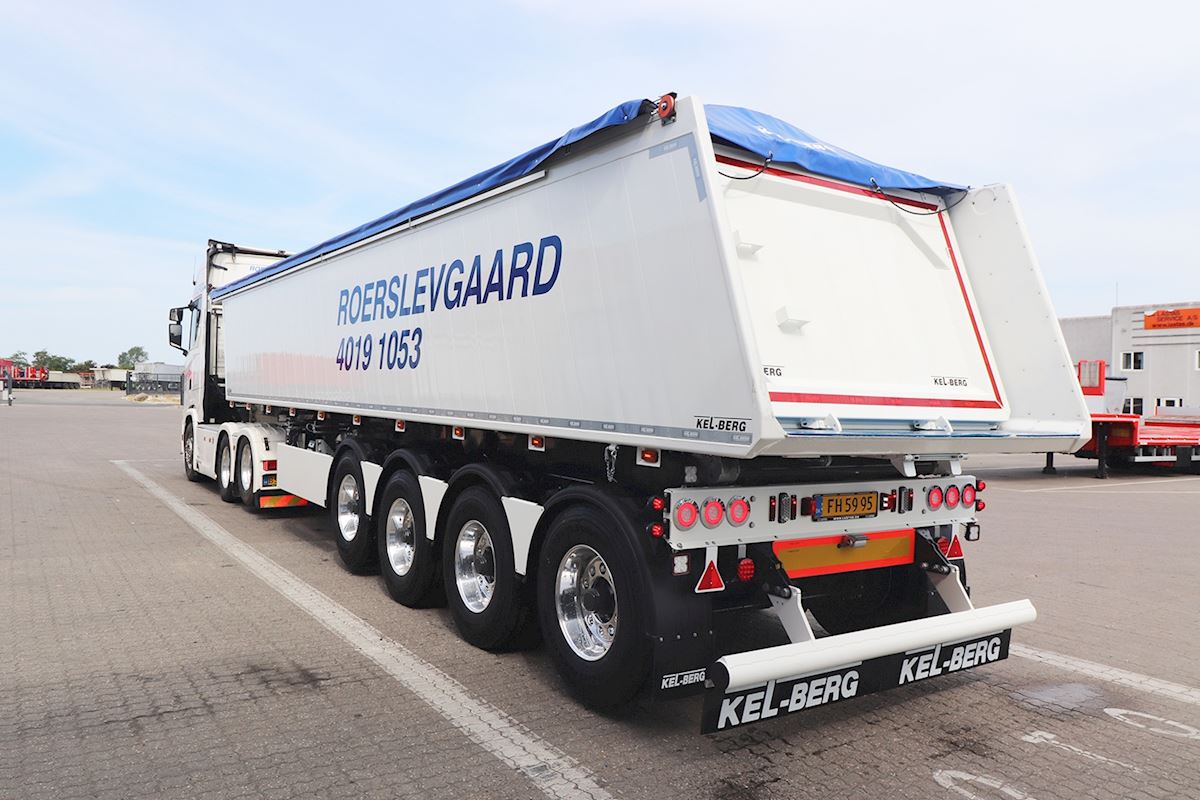 Kel-Berg traileren er leveret med 4 x 9 tons BPW-aksler med tromlebremser, samt original BPW-luftaffjedring og hæve-/sænkeventil. 1. aksel og 4. aksel er løftbar, samt er 4. aksel selvstyrende. Monteret Kel-Berg sikkerhedspakke med tilt-alarm og dumperventil.